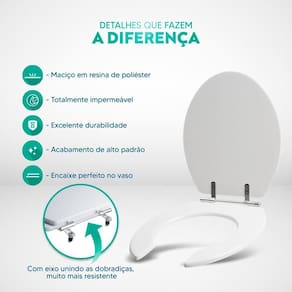 Limpeza: recomenda-se a limpeza do assento sanitário poliéster com água e sabão neutro, não utilizar produtos abrasivos.