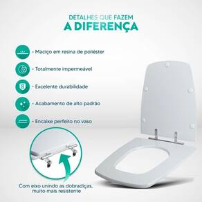 Limpeza: recomenda-se a limpeza do assento sanitário poliéster com água e sabão neutro, não utilizar produtos abrasivos.