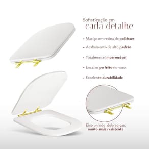 Assento Sanitário Poliéster Antibacteriano Piano Branco Para Vaso Deca Com Ferragem Dourada O Assento Sanitário Poliéster Luxo Piano Branco para vaso Deca completa seu banheiro com elegância e sofisticação. Maciço em resina de poliéster, é considerado o melhor material do mercado de assentos sanitários por ser totalmente impermeável, pelo seu acabamento impecável e excelente durabilidade. Possui proteção antimicrobiana que impede o crescimento de fungos e bactérias no produto. O destaque deste produto está em seu design de linhas retas, na qualidade de seus materiais e acabamentos modernos. A ferragem é em latão cromado na cor Dourada, o mais nobre e sofisticado para assentos sanitários.