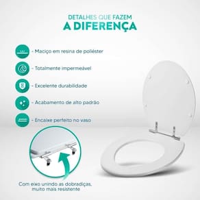 Limpeza: recomenda-se a limpeza do assento sanitário poliéster com água e sabão neutro, não utilizar produtos abrasivos.
