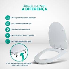 Limpeza: recomenda-se a limpeza do assento sanitário poliéster com água e sabão neutro, não utilizar produtos abrasivos.
