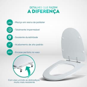 Limpeza: recomenda-se a limpeza do assento sanitário poliéster com água e sabão neutro, não utilizar produtos abrasivos.