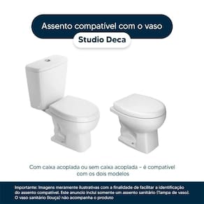 Detalhes e Cuidados Especiais: * Cor: Branco * Compatibilidade: Modelo Studio da marca Deca * Conteúdo da Embalagem: Assento sanitário, parafusos de fixação e instruções de instalação. * Fabricante do Assento Sanitário: Pontto Lavabo.