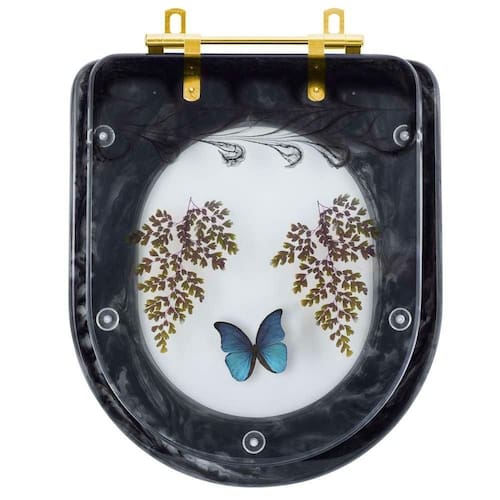 Assento Sanitario Poliester Decorado Borboleta Azul Carrara Preto Com Ferragem Dourada O Assento Sanitario Poliester Decorado Borboleta Azul Carrara Preto com Ferragem Dourada é a opção ideal para quem busca combinar funcionalidade com elegância em seu banheiro. Elegância e Diferenciação: Um design refinado e diferenciais de alto padrão. Com acabamento de excelência e ferragens em alumínio anodizado que não oxidam nem enferrujam, ele é a combinação perfeita de beleza e durabilidade.