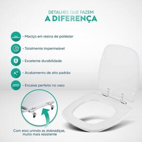 Limpeza: recomenda-se a limpeza do assento sanitário poliéster com água e sabão neutro, não utilizar produtos abrasivos.