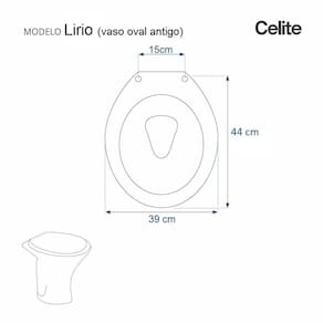 Assento Sanitário Poliéster Lirio Branco para vaso Celite. Este Assento Sanitário termofixo é fabricado em Resina de Poliéster o que lhe garante total impermeabilidade. Acabamento brilhante e ferragem metálica que não oxida. Esta Tampa de Vaso pode ser usada em bacia sanitária com ou sem caixa acoplada. É muito rápido e fácil instalar, acompanha parafusos de fixação e com apenas uma chave de fenda é possível instalar no vaso sanitário. Cor: Branco. Distância entre os parafusos: 15cm. Acabamento: brilhante. Dicas: Itens inclusos: 01 assento sanitário em resina maciça de poliéster Limpeza: fácil limpeza e manutenção. Recomenda-se a limpeza com água e sabão neutro e não utilizar produtos abrasivos ou químicos. Instalação: Não é necessário desmontar nenhuma peça do produto. Posicionar e encaixar na louça sanitária os dois parafusos com as borrachas pretas dentro dos furos do vaso. Aperte com a chave de fenda no sentido horário até ficar firme. Importante: este anúncio inclui somente o produto conforme descrição acima. Todos os elementos decorativos das fotos não estão inclusos. Observação: O código 6LPF / 1.6gpf gravado na louça sanitária corresponde ao fluxo de água de uma descarga e não indica o modelo da mesma.