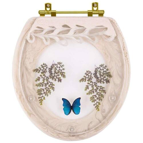 Assento Sanitário Poliester Oval Bege Claro Decorado Borboleta Azul Com Ferragem Dourada