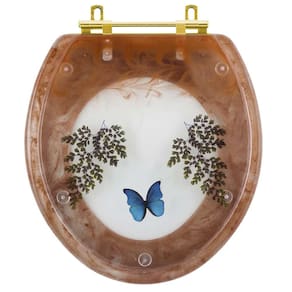Assento Sanitário Poliester Oval Caramelo Decorado Borboleta Azul Com Ferragem Dourada