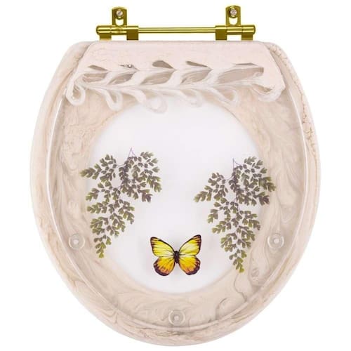 O Assento Sanitário Poliester Oval Creme Decorado Borboleta Amarela Com Ferragem Dourada é a opção ideal para quem busca combinar funcionalidade com elegância em seu banheiro.