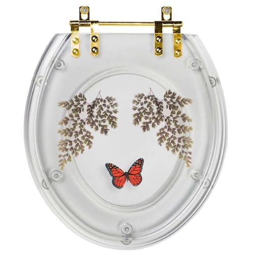 O Assento Sanitário Poliester Oval Transparente Decorado Borboleta Vermelha Com Ferragem Dourada é a opção ideal para quem busca combinar funcionalidade com elegância em seu banheiro.
