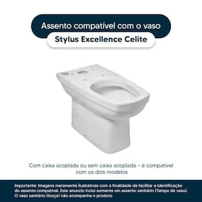 Detalhes e Cuidados Especiais: * Cor: Cinza Claro * Compatibilidade: Modelo Stylus Excellence da marca Celite * Conteúdo da Embalagem: Assento sanitário, parafusos de fixação e instruções de instalação. * Fabricante do Assento Sanitário: Pontto Lavabo.