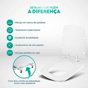 Limpeza: recomenda-se a limpeza do assento sanitário poliéster com água e sabão neutro, não utilizar produtos abrasivos.