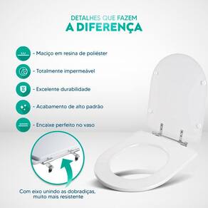 Limpeza: recomenda-se a limpeza do assento sanitário poliéster com água e sabão neutro, não utilizar produtos abrasivos.