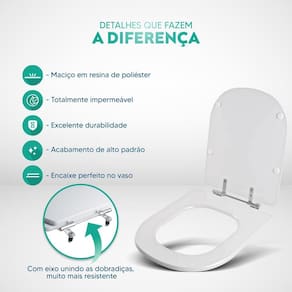 Durabilidade e Resistência: Fabricado em resina maciça de poliéster, este assento sanitário é altamente resistente e totalmente impermeável.