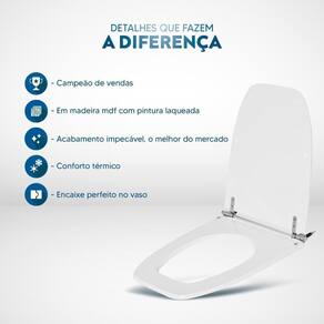 Durabilidade e Resistência: Fabricado em MDF com camadas de pintura laqueada, este assento oferece não apenas beleza, mas também conforto térmico e alta resistência. Seu acabamento impecável adiciona um toque de classe ao seu banheiro.
