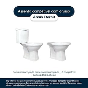 Detalhes e Cuidados Especiais: * Cor: Branco * Compatibilidade: Modelo Arcus da marca Eternit * Conteúdo da Embalagem: Assento sanitário, parafusos de fixação e instruções de instalação. * Fabricante do Assento Sanitário: Pontto Lavabo.