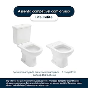 Detalhes e Cuidados Especiais: * Cor: Preto * Compatibilidade: Modelo Life da marca Celite * Conteúdo da Embalagem: Assento sanitário, parafusos de fixação e instruções de instalação. * Fabricante do Assento Sanitário: Pontto Lavabo.