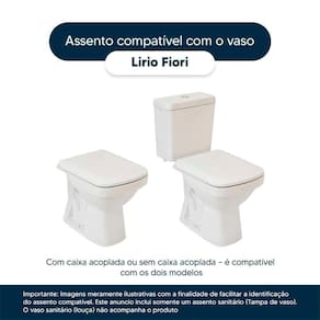 Detalhes e Cuidados Especiais: * Cor: Cinza Claro * Compatibilidade: Modelo Lirio da marca Fiori * Conteúdo da Embalagem: Assento sanitário, parafusos de fixação e instruções de instalação. * Fabricante do Assento Sanitário: Pontto Lavabo.