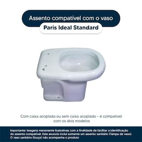 Instalação Simples e Rápida: Com todos os parafusos e componentes necessários inclusos, a instalação é rápida e descomplicada. Seu novo assento estará pronto para uso em questão de minutos. Desenvolvido especificamente para o modelo Paris da marca Ideal Standard, com ou sem caixa acoplada, proporciona um encaixe perfeito, oferecendo estabilidade e conforto durante o uso.