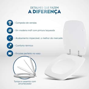 Durabilidade e Resistência: Fabricado em MDF com camadas de pintura laqueada, este assento oferece não apenas beleza, mas também conforto térmico e alta resistência. Seu acabamento impecável adiciona um toque de classe ao seu banheiro.