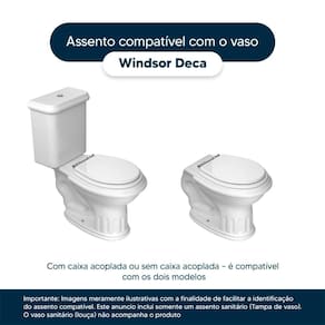 Detalhes e Cuidados Especiais: * Cor: Preto * Compatibilidade: Modelo Windsor da marca Deca * Conteúdo da Embalagem: Assento sanitário, parafusos de fixação e instruções de instalação. * Fabricante do Assento Sanitário: Pontto Lavabo.