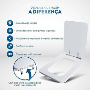 Itens inclusos: assento e tampa em madeira MDF com pintura laqueada. Ferragens metálicas em alumínio anodizado muito resistente, não oxidam e não enferrujam.