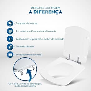 Itens inclusos: assento e tampa em madeira MDF com pintura laqueada. Ferragens metálicas em alumínio anodizado muito resistente, não oxidam e não enferrujam.