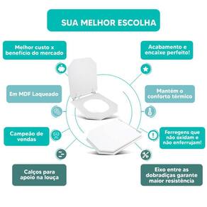 MATERIAL * Fabricado em madeira MDF com Pintura Laqueada na cor Branco * Mantém o conforto térmico do assento sanitário.