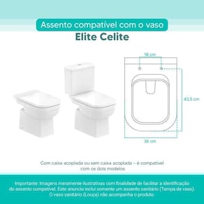 OBS.: O código 6LPF gravado na louça sanitária corresponde ao fluxo de água de uma descarga e não indica o modelo da mesma. RBN: Casa/Banho/Instalações e Acessórios de Banheiro/Vasos Sanitários e Peças/Assento de Vaso Sanitário | Conteúdo da Embalagem: 01 Assento Sanitário | Tipo: Assento Sanitário | Produto: Assento Sanitário | Site do Fabricante: | Marca do Assento Sanitário: Pontto Lavabo | : 6 meses contra defeitos de fabricação | Dica: Instalação: sem desmontar o produto, posicione sobre o vaso sanitário e encaixe os dois parafusos com as borrachas pretas dentro do furo do vaso. Aperte com a chave de fenda no sentido horário até ficar firme. | Para Vaso Sanitário do Modelo: Elite | Para vaso Sanitário da Marca: Celite | Cor: Branco | Tonalidade: Branco | Material do Assento Sanitário: MDF Laqueado | Instruções de Limpeza: Recomenda-se a limpeza com pano úmido e sabão neutro, não utilizar produtos abrasivos ou químicos | Almofadado?: Não | Peso do Produto: | Tipo de Fechamento: Fechamento Comum | Material da Fixação: Alumínio Anodizado | Precisa de baterias ou pilhas: Não | Regulamentações aplicáveis a produtos perigosos: Não aplicável | Código de certificação: Não aplicável | Ponto de Destaque01: Produzido em MDF Laqueado | Ponto de Destaque02: Ferragem em Alumínio Anodizado (não enferruja, não oxida) | Ponto de Destaque03: Possui 15cm de distância entre furos | Ponto de Destaque04: Produto vai completo, fácil instalação | Ponto de Destaque05: Pontto Lavabo | Termos de Pesquisa01: Assento Sanitário; Tampa de Vaso Sanitário; Elite Branco Celite; Elite 6lpf; Celite 6lpf | Quantidade de itens: 1 | Fonte de energia: Não aplicável | Dimensões da embalagem: Altura: 5cm x Largura: 40cm x Comprimento: 50cm | de caixas: 1