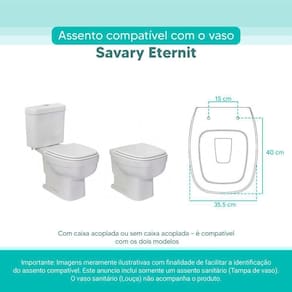 OBS.: O código 6LPF gravado na louça sanitária corresponde ao fluxo de água de uma descarga e não indica o modelo da mesma. RBN: Casa/Banho/Instalações e Acessórios de Banheiro/Vasos Sanitários e Peças/Assento de Vaso Sanitário | Conteúdo da Embalagem: 01 Assento Sanitário | Tipo: Assento Sanitário | Produto: Assento Sanitário | Site do Fabricante: www.ponttolavabo.com.br/ | Marca do Assento Sanitário: Pontto Lavabo | Garantia: 6 meses contra defeitos de fabricação | Dica: Instalação: sem desmontar o produto, posicione sobre o vaso sanitário e encaixe os dois parafusos com as borrachas pretas dentro do furo do vaso. Aperte com a chave de fenda no sentido horário até ficar firme. | Para Vaso Sanitário do Modelo: Savary | Para vaso Sanitário da Marca: Eternit | Cor: Branco | Tonalidade: Branco | Material do Assento Sanitário: MDF Laqueado | Instruções de Limpeza: Recomenda-se a limpeza com pano úmido e sabão neutro, não utilizar produtos abrasivos ou químicos | Almofadado?: Não | Peso do Produto: 1.98 | Tipo de Fechamento: Fechamento Comum | Material da Fixação: Alumínio Anodizado | Precisa de baterias ou pilhas: Não | Regulamentações aplicáveis a produtos perigosos: Não se aplica | Código de certificação: Não se aplica Ean: 7899983693155