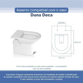 Assento Sanitário Tampa De Vaso Branco Resina Poliester Duna Para Bacia Deca O Assento Sanitário Tampa de Vaso Branco Resina Poliester Duna para bacia Deca é o que faltava para deixar seu banheiro ainda mais bonito. EXELENTE DURABILIDADE * É totalmente impermeável * Pode ser lavado com água à vontade