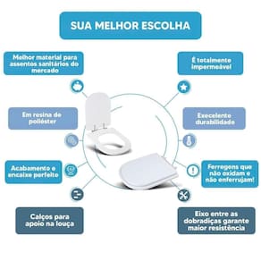 DIFERENCIAL * Possui calços que evitam o contato direto com a louça e que o assento deslize lateralmente. * Proporcionam maior estabilidade durante o uso. * Acabamento e encaixe perfeito no vaso sanitário. * Possui eixo entre as dobradiças, mantendo o assento sanitário firme na louça. * Sua ferragem metálica é super resistente e não oxida e nem enferruja.