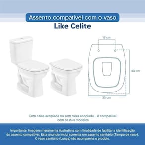 OBS.: O código 6LPF gravado na louça sanitária corresponde ao fluxo de água de uma descarga e não indica o modelo da mesma. RBN: Casa/Banho/Instalações e Acessórios de Banheiro/Vasos Sanitários e Peças/Assento de Vaso Sanitário | Conteúdo da Embalagem: 01 Assento Sanitário | Tipo: Assento Sanitário | Produto: Assento Sanitário | Site do Fabricante: www.ponttolavabo.com.br/ | Marca do Assento Sanitário: Pontto Lavabo | Garantia: 6 meses contra defeitos de fabricação | Dica: Instalação: sem desmontar o produto, posicione sobre o vaso sanitário e encaixe os dois parafusos com as borrachas pretas dentro do furo do vaso. Aperte com a chave de fenda no sentido horário até ficar firme. | Para Vaso Sanitário do Modelo: Like | Para vaso Sanitário da Marca: Celite | Cor: Branco | Tonalidade: Branco | Material do Assento Sanitário: Poliéster | Instruções de Limpeza: Recomenda-se a limpeza com água e sabão neutro, não utilizar produtos abrasivos ou químicos | Almofadado?: Não | Peso do Produto: 2.98 | Tipo de Fechamento: Fechamento Comum | Material da Fixação: Alumínio Anodizado | Precisa de baterias ou pilhas: Não | Regulamentações aplicáveis a produtos perigosos: Não se aplica | Código de certificação: Não se aplica Ean: 7899983691359