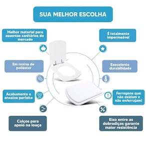 MATERIAL * Fabricado em Resina de Poliéster na cor Branca * É considerado o melhor material para assentos sanitários do mercado