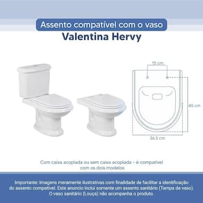 Assento Sanitário Tampa De Vaso Branco Resina Poliester Valentina Para Bacia Hervy O Assento Sanitário Tampa de Vaso Branco Resina Poliester Valentina para bacia Hervy é o que faltava para deixar seu banheiro ainda mais bonito. EXELENTE DURABILIDADE * É totalmente impermeável * Pode ser lavado com água à vontade