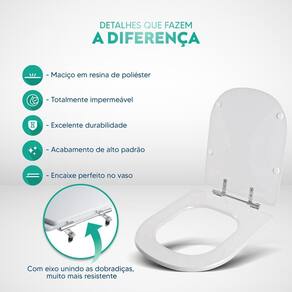 Limpeza: recomenda-se a limpeza do assento sanitário poliéster com água e sabão neutro, não utilizar produtos abrasivos.