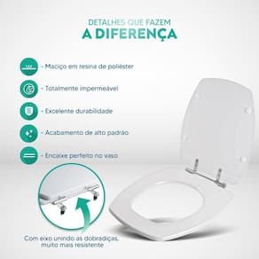 Limpeza: recomenda-se a limpeza do assento sanitário poliéster com água e sabão neutro, não utilizar produtos abrasivos.