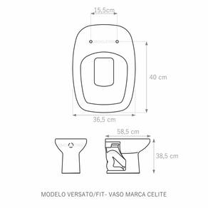 Assento Sanitário (tampa de vaso) fabricado em madeira MDF com pintura laqueada, com proteção raios UV, que garante excelente acabamento e durabilidade. Compatível com vasos (bacias/louças) sanitários com ou sem caixa acoplada. Tem calços de PVC instalados na tampa e no assento para proporcionar estabilidade ao uso, pois distribui o peso uniformemente sobre a louça sanitária. Montagem simples e fácil. Possui ferragem em alumínio anodizado que não enferruja/oxida e oferece muita resistência. O assento é acompanhado por parafusos para instalação. Embalagem dupla reforçada garante o recebimento do produto totalmente protegido. Especificações: - Dimensões da caixa: largura: 51,50cm. Altura: 4,00cm comprimento: 38,00cm - Peso do produto: 1,98kg - Acabamento: brilhante - Uso: este assento é adequado para uso na louça Celite modelo Versato/Fit - Garantia: 3 meses - Itens inclusos: Tampa e assento em MDF com calços de PVC, ferragem inoxidável, embalagem duplamente reforçada. Contém todos os parafusos e encaixes para instalação, sendo necessária somente uma chave de fenda para instalar o produto na louça sanitária. Instalação: posicione o produto, devidamente centralizado, em cima do vaso sanitário. Sem desmontar a ferragem, insira as buchas de borracha dentro dos furos da bacia sanitária. Encaixe os parafusos e posicione as porcas. Utilizando uma chave de fenda, aperte o parafuso no sentido horário até que o assento esteja firme e fixo no vaso. Manutenção: recomendamos a limpeza periódica com pano levemente umedecido com sabão neutro. Não usar esponjas abrasivas ou palha de aço nem qualquer tipo de produto químico. Marca: LOJAROCCA