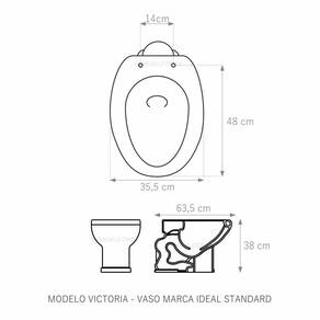 Assento Sanitário tampa de vaso fabricado em madeira MDF com pintura laqueada, com proteção raios UV, que garante excelente acabamento e durabilidade. Compatível com vasos bacias/louças sanitários com ou sem caixa acoplada. Tem calços de PVC instalados na tampa e no assento para proporcionar estabilidade ao uso, pois distribui o peso uniformemente sobre a louça sanitária. Montagem simples e fácil. Possui ferragem em alumínio anodizado que não enferruja/oxida e oferece muita resistência. O assento é acompanhado por parafusos para instalação. Embalagem dupla reforçada garante o recebimento do produto totalmente protegido. Especificações: - Dimensões da caixa: largura: 49,50cm. Altura: 4,00cm comprimento: 39,50cm - Peso do produto: 1,98kg - Acabamento: brilhante - Uso: este assento é adequado para uso na louça Ideal Standard modelo Victoria - Garantia: 3 meses - Itens inclusos: Tampa e assento em MDF com calços de PVC, ferragem inoxidável, embalagem duplamente reforçada. Contém todos os parafusos e encaixes para instalação, sendo necessária somente uma chave de fenda para instalar o produto na louça sanitária. Instalação: posicione o produto, devidamente centralizado, em cima do vaso sanitário. Sem desmontar a ferragem, insira as buchas de borracha dentro dos furos da bacia sanitária. Encaixe os parafusos e posicione as porcas. Utilizando uma chave de fenda, aperte o parafuso no sentido horário até que o assento esteja firme e fixo no vaso. Manutenção: recomendamos a limpeza periódica com pano levemente umedecido com sabão neutro. Não usar esponjas abrasivas ou palha de aço nem qualquer tipo de produto químico.