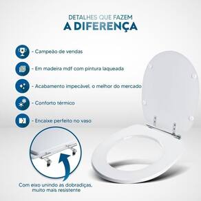 Durabilidade e Resistência: Fabricado em MDF com camadas de pintura laqueada, este assento oferece não apenas beleza, mas também conforto térmico e alta resistência. Seu acabamento impecável adiciona um toque de classe ao seu banheiro.