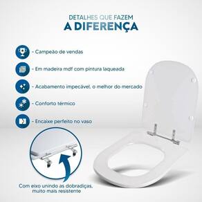 Itens inclusos: assento e tampa em madeira MDF com pintura laqueada. Ferragens metálicas em alumínio anodizado muito resistente, não oxidam e não enferrujam.