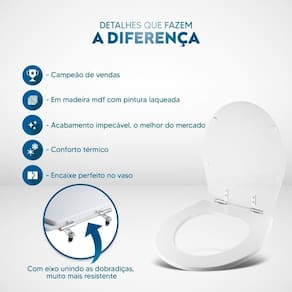 Durabilidade e Resistência: Fabricado em MDF com camadas de pintura laqueada, este assento oferece não apenas beleza, mas também conforto térmico e alta resistência. Seu acabamento impecável adiciona um toque de classe ao seu banheiro.