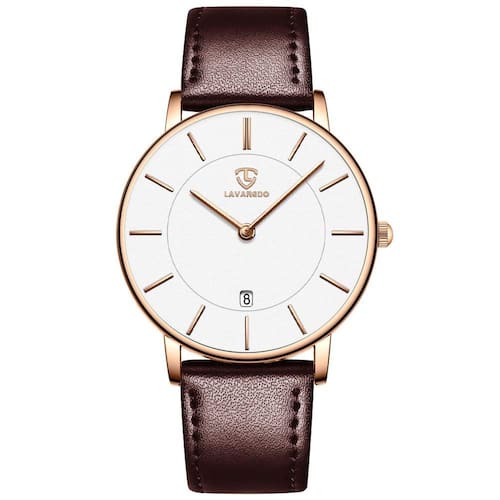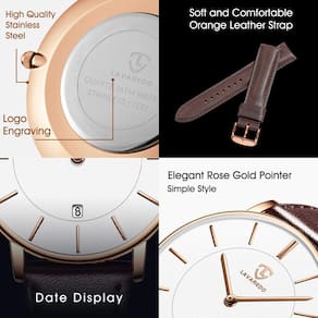 - Relógio de pulso moderno: mostrador clássico e elegante, elegantes marcas de hora em ouro rosa e pequena janela de data. Design moderno adequado para homens e mulheres.