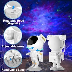 Chegou a sua hora de subir aos céus nessa vida .Este projetor astronauta simula um céu estrelado, com suas galáxias e estrelas. São exibidas até 08 tipos de galáxias diferentes, cuja velocidade e brilho podem ser alterados, assim como o das estrelas. Tanto as estrelas quanto as galáxias podem ser exibidas juntas ou separadamente. Possui timer inteligente, que pode ser ajustado em 45 ou 90 minutos.