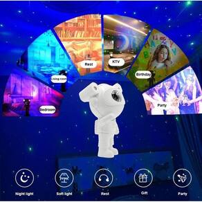 Astronauta Projetor de Luz Noturna com o Céu Estrelado e a Lua, com 82 tipos de efeito de luz, Bluetooth musica, TF player sendo possível alterar velocidade e intensidade, Possui timer inteligente de 30 minutos / 1 hora / 2 horas. A cabeça do astronauta é fixada por imãs, pode ser ajustada em 360 graus, de acordo com as necessidades das diferentes cenas, Tornando o ambiente agradável para usar.