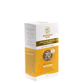 Protetor solar facial para todos os tipos de pele. Australian Gold FPS 70 oferece alta proteção UVA e UVB, toque seco e ação antipoluição, antioleosidade e antienvelhecimento.