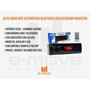 Auto Rádio Mp3 Automotivo Bluetooth Usb Rs2604br Roadstar Somos a E-MOVE.Trabalhamos com qualidade, velocidade e confiança nas suas compras. ------------------------------------------------------------------------------ Auto Rádio Mp3 Automotivo Bluetooth Usb Rs2604br Roadstar Descrição do Produto: O som automotivo da Roadstar vai ser o seu melhor companheiro para aumentar o volume e desfrutar do caminho. Sempre pronto para você mergulhar na música que mais gosta e com o melhor som. Os seus passeios de carro serão mais divertidos Aplicação: Universal; Em todos os veículos. Benefícios: Diversos botões e ações, entradas de mídia práticas, reset e segurando o botão de avanço por 2 segundos, o aparelho pula 10 em 10 músicas. Com memória para 18 estações de rádio. Acompanha controle e possui funcionalidade com controle por APP. Características Técnicas:Modelo: RS2604BRTipo: MP3Conectividade: Bluetooth, Micro SD, USB Até 32Gb e AUX.Saídas: 4 saídas RCA de áudioPotência WRMS: 120 4x30 Luzes em LED azulControle via APP Itens Inclusos: 01 Rádio MP3 Bluetooth01 Controle remotoManual-----------------------------------------------------------------------------------------------------------------RECOMENDAÇÕES ANTES DA COMPRAVerifique a compatibilidade do produto para garantir que não haja nenhum problema de uso.Verifique a tensão, potência, impedância e outros detalhes que impossibilitem a instalação ou que possa causar danos ao produto ou veículo.Para os produtos que necessitam de instalação, antes da mesma deverá ser feito o teste de bancada para verificação do funcionamento dele.A instalação deve ser feita por profissionais capacitados, não nos responsabilizamos pelo uso incorreto ou instalação incorreta do usuário ou do profissional não qualificado.