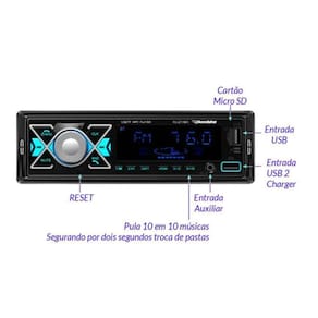 A conectividade é um dos grandes destaques do RS-2714BR Plus. Além de contar com conexão Bluetooth para você reproduzir músicas diretamente do seu smartphone, o auto rádio também possui entrada auxiliar frontal, entrada para cartão micro SD e duas entradas USB dedicadas: uma para recarregar dispositivos e outra para reproduzir arquivos de áudio a partir de um pen drive. Essa combinação de opções permite que você escolha a melhor forma de aproveitar suas músicas e podcasts, sem complicações.