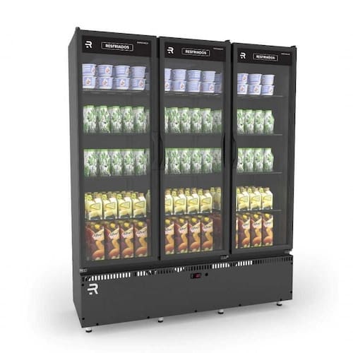 Auto Serviço Vanguard Resfriados 958l 3 Portas Asvr3p 220v - Refrimate DESCRIÇÃO DO PRODUTO: - Aplicação: Frios e Laticínios ou Frutas e Verduras (caixas avulsas); - Sistema de refrigeração: Ar forçado; - Temperatura de trabalho: 0C a 7C; - Controlador digital de temperatura; - (Iluminação LED na colunas); - Gabinete em aço galvanizado pintado interno preto e externo preto; - Prateleiras: Grades aramadas pintadas com regulagem de altura; - Portas em vidro temperado; - Pés termoplásticos com regulagem de altura; - Cor: (Preto externo/Preto interno);