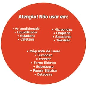 - ar condicionado - liquidificador - cafeteira - máquina de lavar - furadeira - geladeira - freezer - secador/escova de cabelo - prancha de alisamento chapinha - forno elétrico - bebedouro - micro-ondas - televisão - aspirador de pó - processador de alimentos - churrasqueira - panela elétrica - batedeira - vídeo game